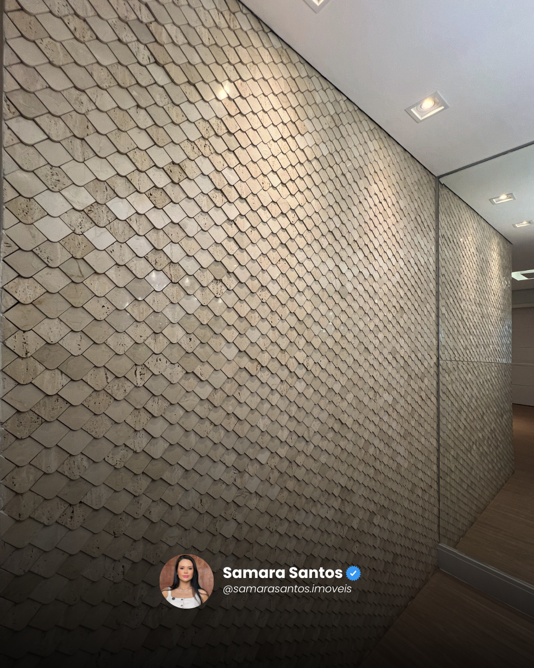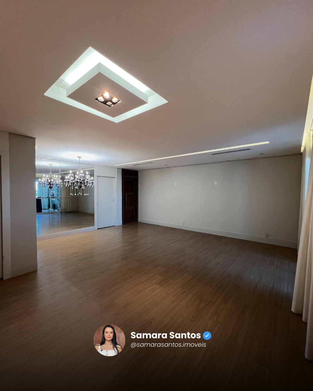👉 Sala de estar e jantar finamente decoradas, com lustre, painel espelhado e revestimentos de alto padrão.